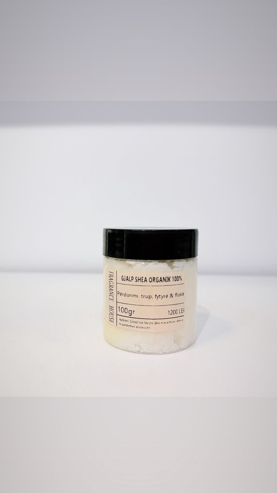 Gjalp shea 100% organik dhe natyral, me origjinë nga Mbretëria e Bashkuar. I pasur me vitamina A, E dhe F, ky produkt është një hidratues i fuqishëm dhe rigjenerues për lëkurën dhe flokët. Tekstura e tij e butë dhe e pasur e bën të lehtë aplikimin dhe përthithjen.