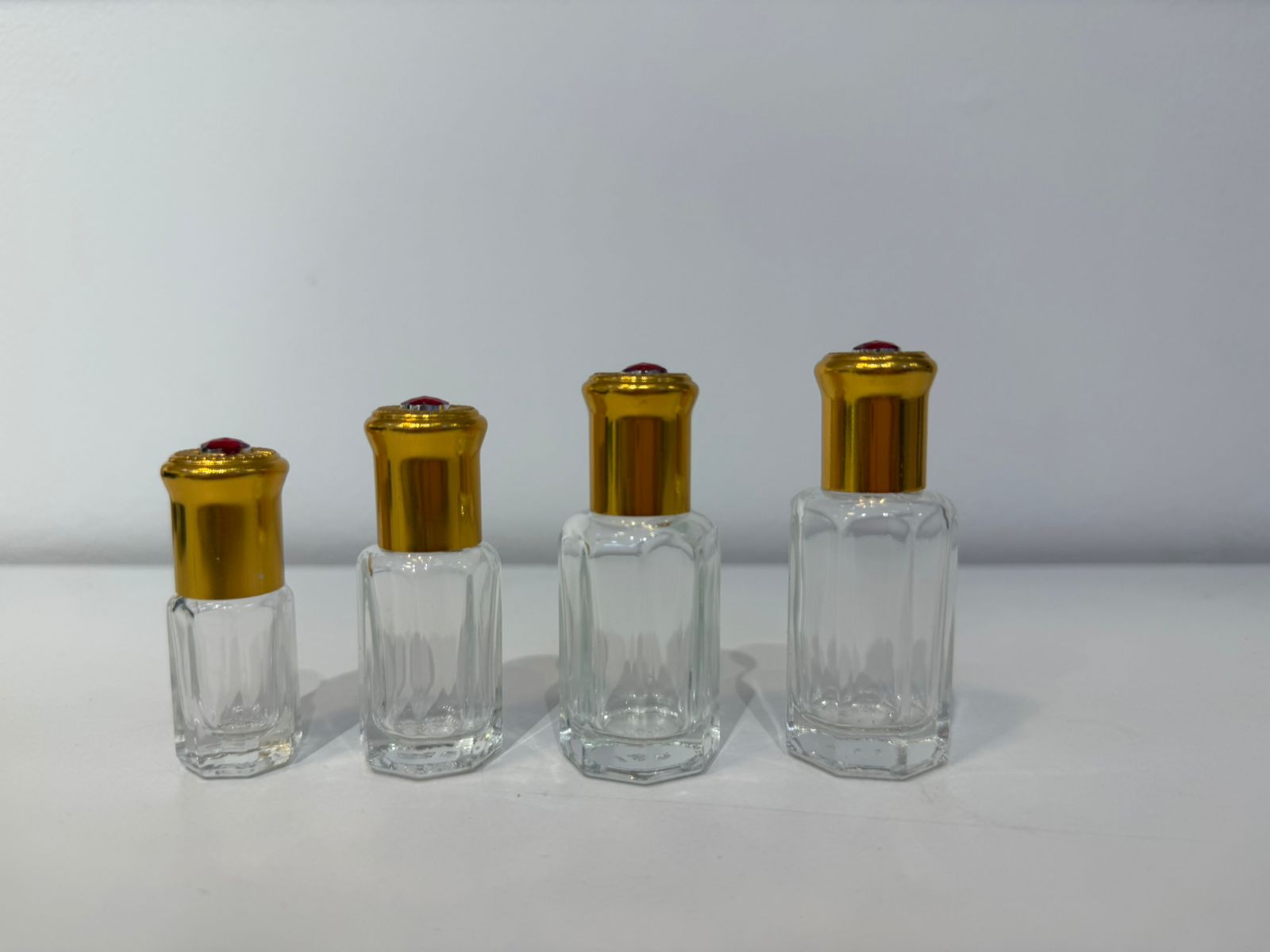 Shishe elegante qelqi transparente, të pajisura me roll-on për aplikim të saktë dhe të butë.